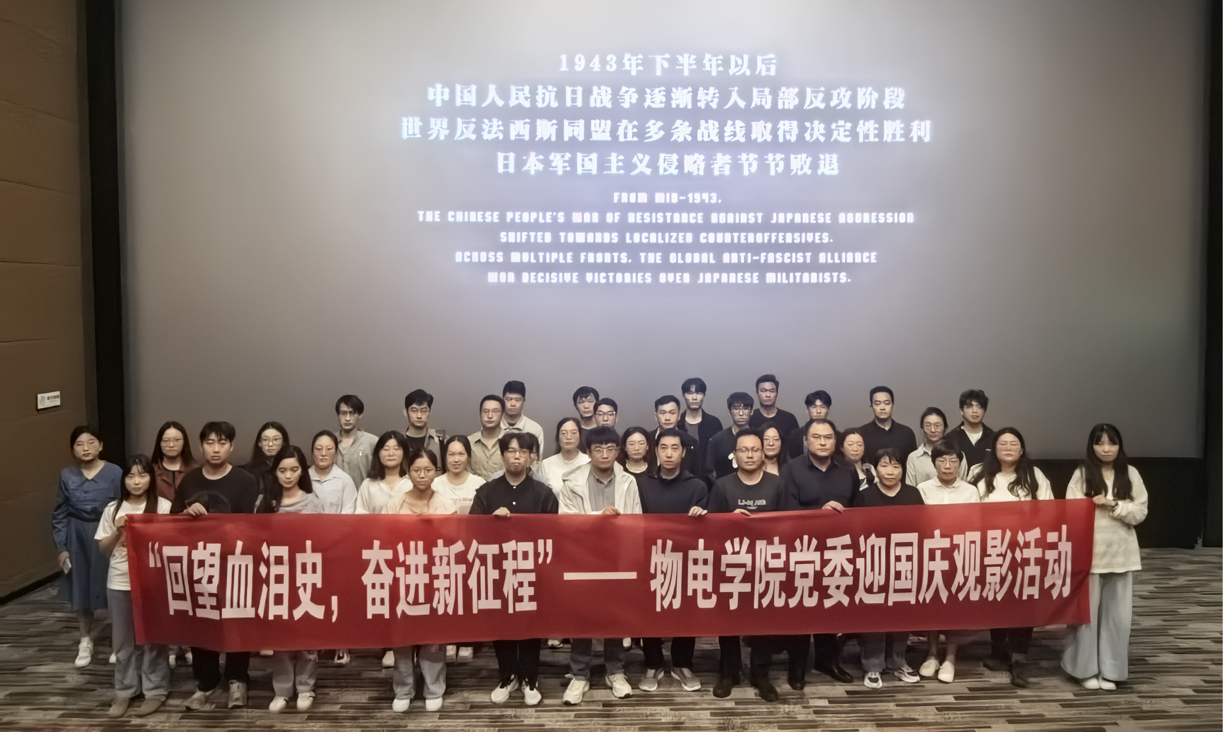 为迎接中华人民共和国成立76周年,深刻铭记历史、缅怀先烈、警示未来,9月29日,物电学院党委以“回望血泪史,奋进新征程”为主题,组织师生党员集中观看电影《731》,开展了一场深刻的爱国主义教育活动。电影《731》讲述的是1945年抗战胜利前夕,侵华日军第731部队在哈尔滨平房区秘密进行惨无人道的细菌战研究,以平民视角揭露日军反人类暴行的电影。电影基于大量史料创作,前后筹备十余年,全景式展现了受害者的血泪遭遇与不屈抗争,...