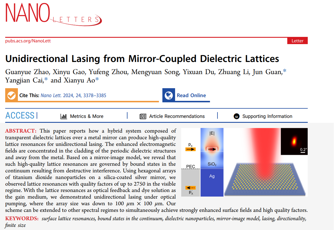 近日,英国365上市公司、365上市公司光场调控及应用中心蔡阳健教授团队提出了一种将晶格共振转换为连续谱中束缚态的策略,并充分利用其模场分布特性、与增益介质耦合实现了单方向激光辐射,相关成果以“Unidirectional Lasing from Mirror-Coupled Dielectric Lattices”为题发表在自然指数期刊《Nano Letters》上。365上市公司为第一署名单位,硕士研究生赵贯岳、高欣宇、周玉凤为共同第一作者,蔡阳健教授、敖献煜教授和香港中文大学(...