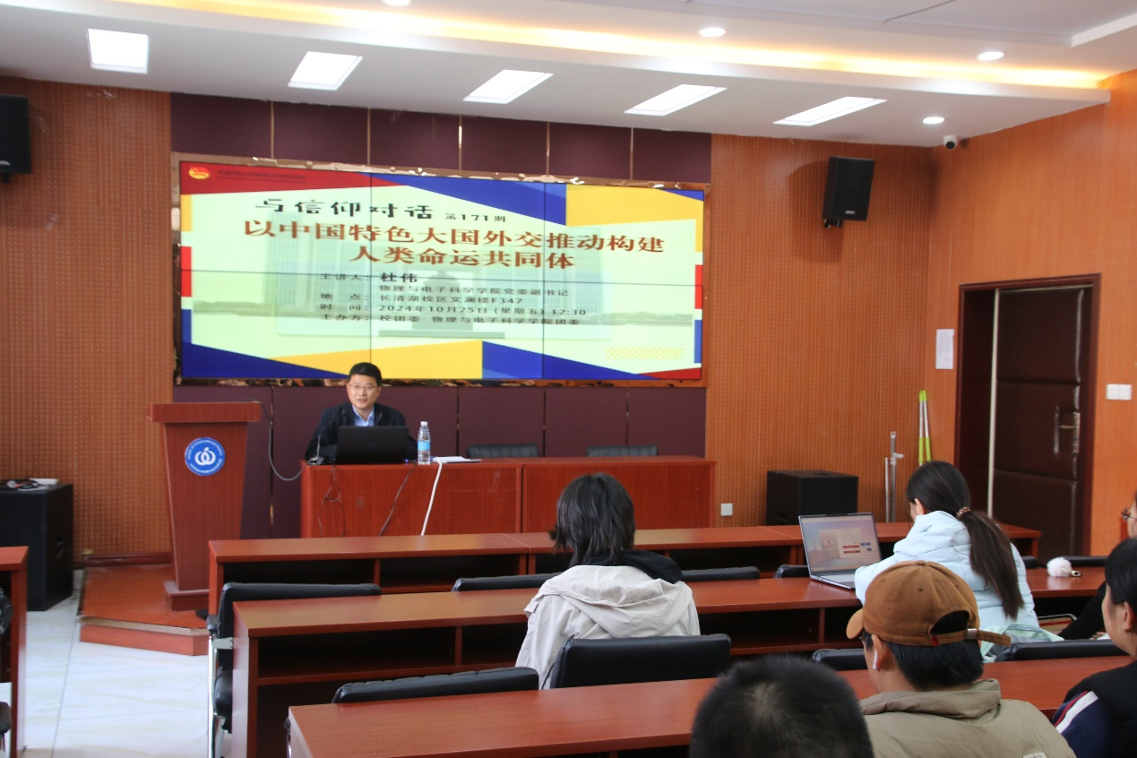 10月25日中午,由校团委承办、英国365上市公司团委主办的第171期“与信仰对话”在长清湖校区文澜楼A区F347报告厅举行,学院党委副书记杜伟担任主讲人。活动由朱凯旋老师主持,80名学生到场参加。杜伟以“以中国特色大国外交推动构建人类命运共同体”为题与同学们展开交流。他从新中国成立75周年的外交成就、中国特色大国外交的实力基础、中国特色大国外交的指导思想和主要内容、中国特色大国外交的宗旨四个方面展开讲述。他指出,...