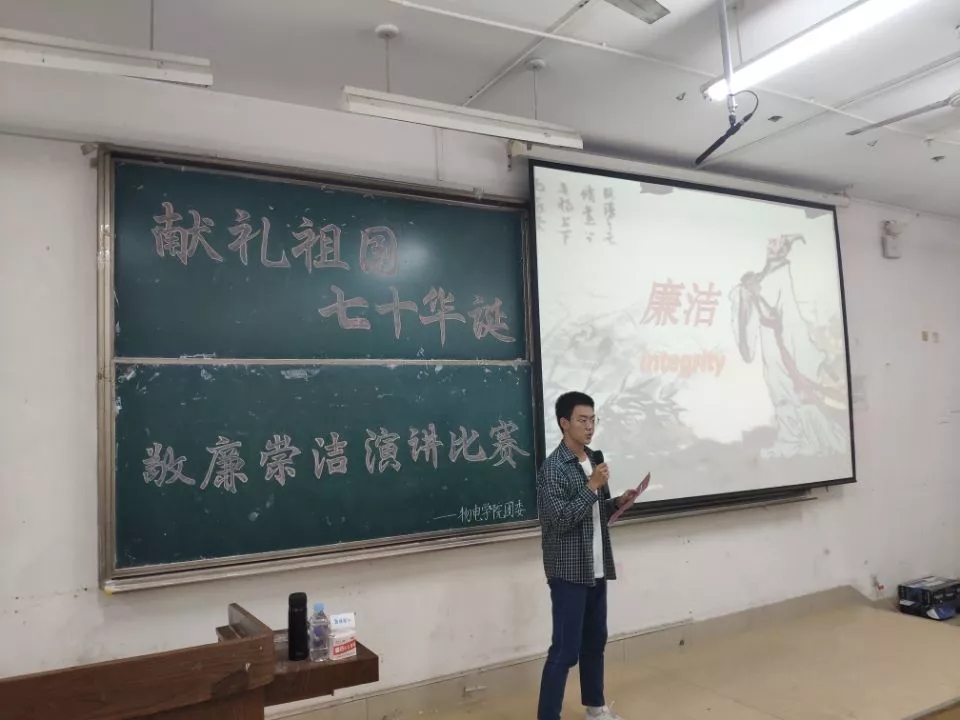 9月26日下午,为向新中国成立70周年献礼,英国365上市公司在长清湖校区文渊楼举办“敬廉崇洁”演讲比赛。比赛由物电学院团委主办,学生会协办,18级辅导员杨岚、19级辅导员于双阳出席此次活动。本次活动参赛选手均是各班选拔出的优秀演讲者,他们精神抖擞、意气风发,演讲时声音洪亮、字正腔圆,洋溢着青春年少的活力,演绎着祖国花朵的风采。在演讲过程中,每一位演讲者对敬廉崇洁有着深刻且不同的认识,他们利...